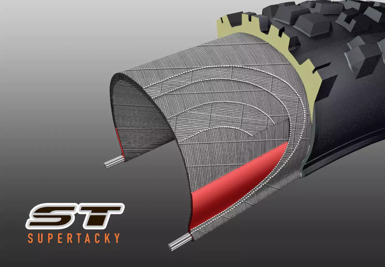 Super Tacky (ST) es un compuesto especial de bajo rebote y alta tracción que se utiliza en neumáticos de montaña selectos.